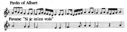 "In general performers should beware of too reverent an attitude towards the notation - the relative carelessness with which the Attaingnant books were produced would suggest that the written notes need not be taken too literally. The most obvious aspect of this is ornamentation: the Attaingnant books have very little in the way of melodic embellishment, and this is true of most sixteenth-century ensemble music. Occasionally examples of written-out ornamentation may be found. One such is the Pavane "Si je m'en vois" (third book, no1), which occurs in a manuscript source (British Library, Royal Appendix 74-6) with the title "Pavin of Albart" - a comparison of the middle section of each version is quite interesting:"